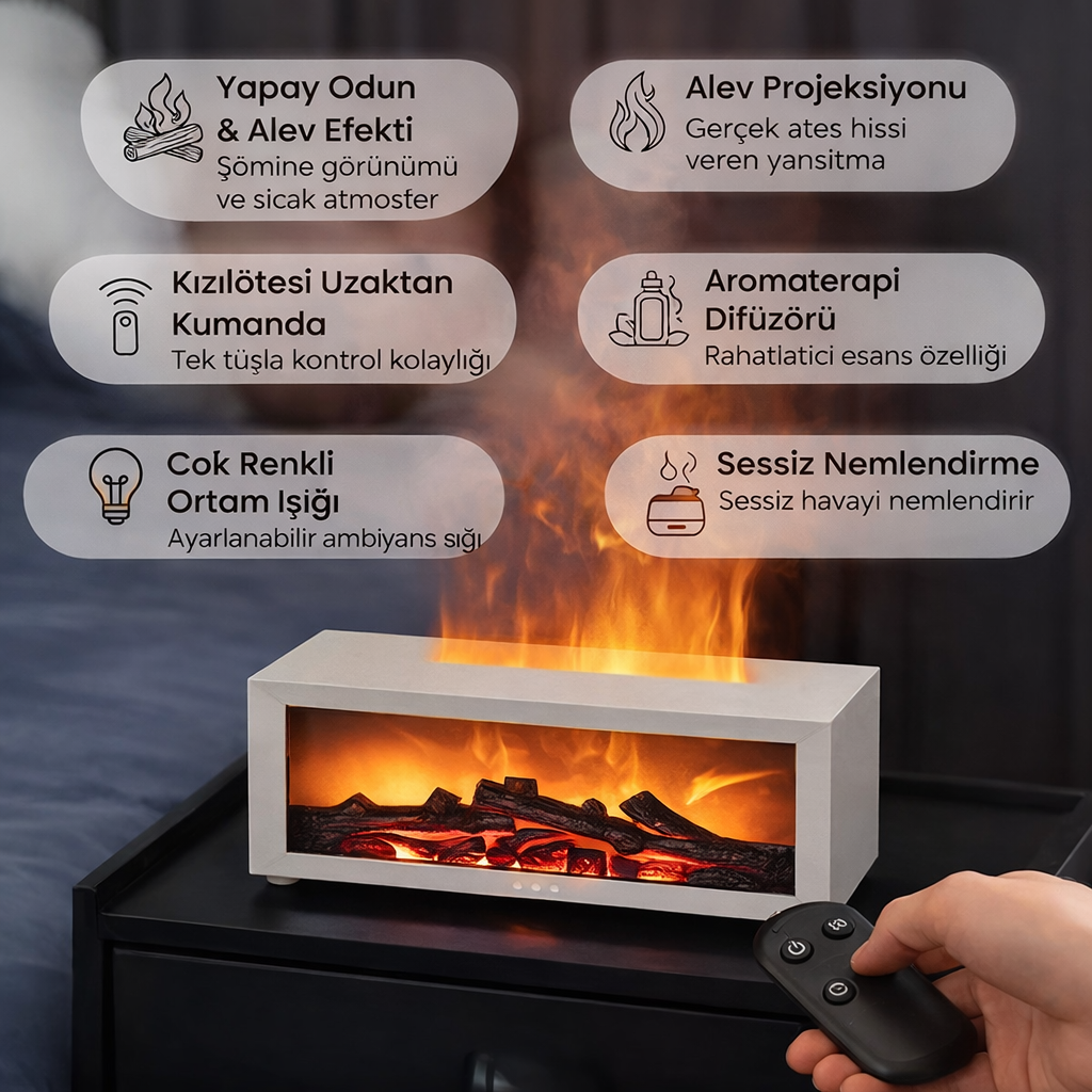 Gerçekçi şömine görünümüyle sıcak ve cozy bir atmosfer oluşturur.